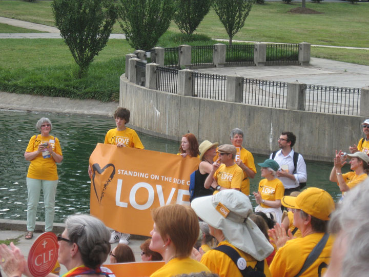 We were there to hear about the discriminatory bill in North Carolina against worker rights for GLBTQ people and to sign petitions against it. Just as the closing prayer was delivered, a thunderstorm gave us a real baptism. Chaos ensued, especially for people in wheelchairs that could not get wet. Banners became “umbrellas” where needed, while most of us scurried back to the Convention Center or to our hotels to dry off.