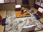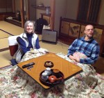 Thanks to GPS we found our way to Yamanouchi-machi. We checked into our large room  and found tea waiting for us. The square table has four adjustable stadium-type seats on the floor. Under the table top are blankets and a quilt to hold in heat generated by heat lamps that are protected by a mesh cage. We can choose low, med, or high heat and our legs are toasty warm! We have enjoyed tea and good conversation here several times a day.