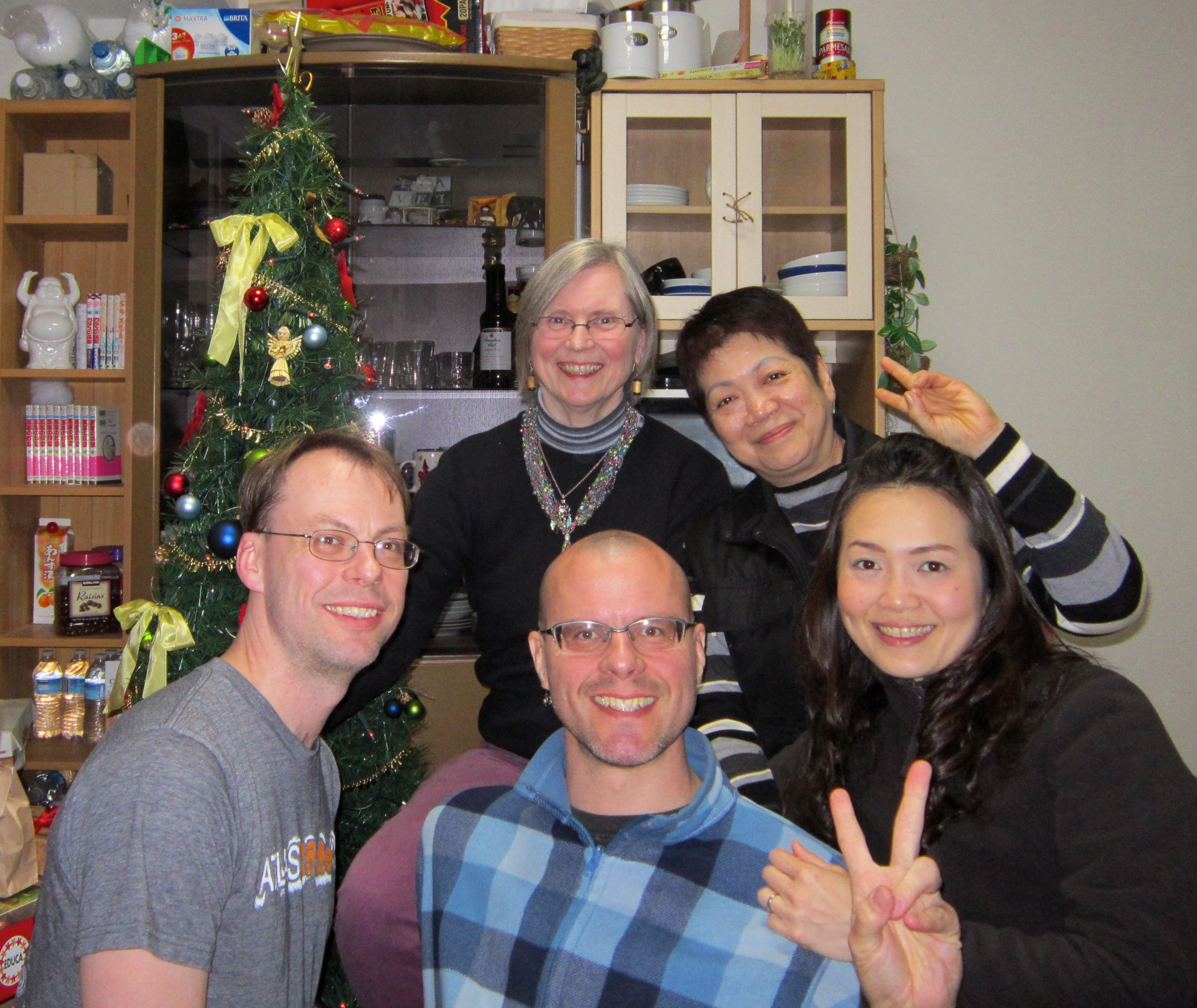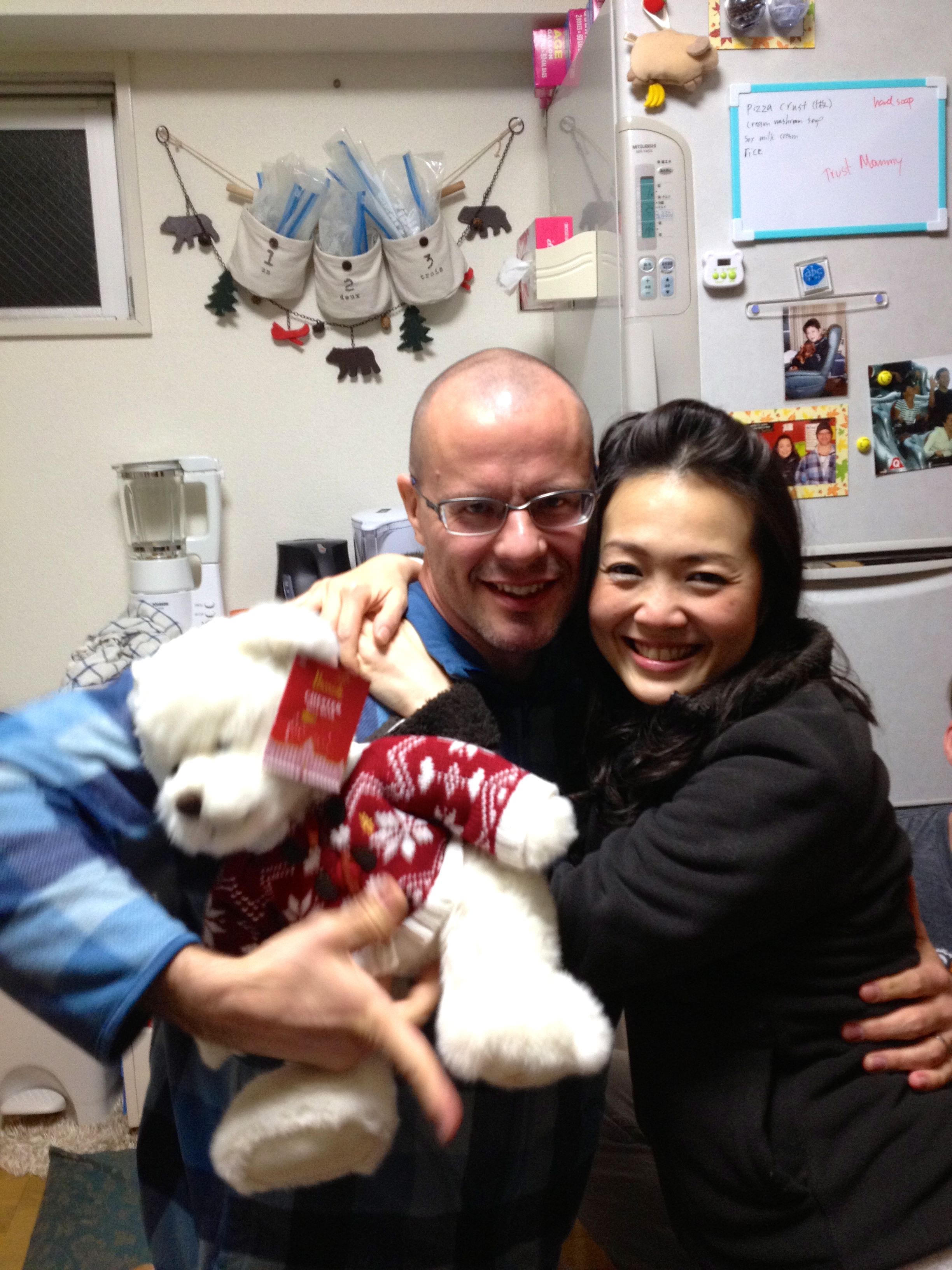 Back in Japan, we celebrated Christmas on Dec. 30. The most fun gift unwrapping was in layers of boxes and tape. Each box was labeled for another person, until it got all the way around the group and back to Lin–the Hallmark 2012 Bear she had wanted for so long!