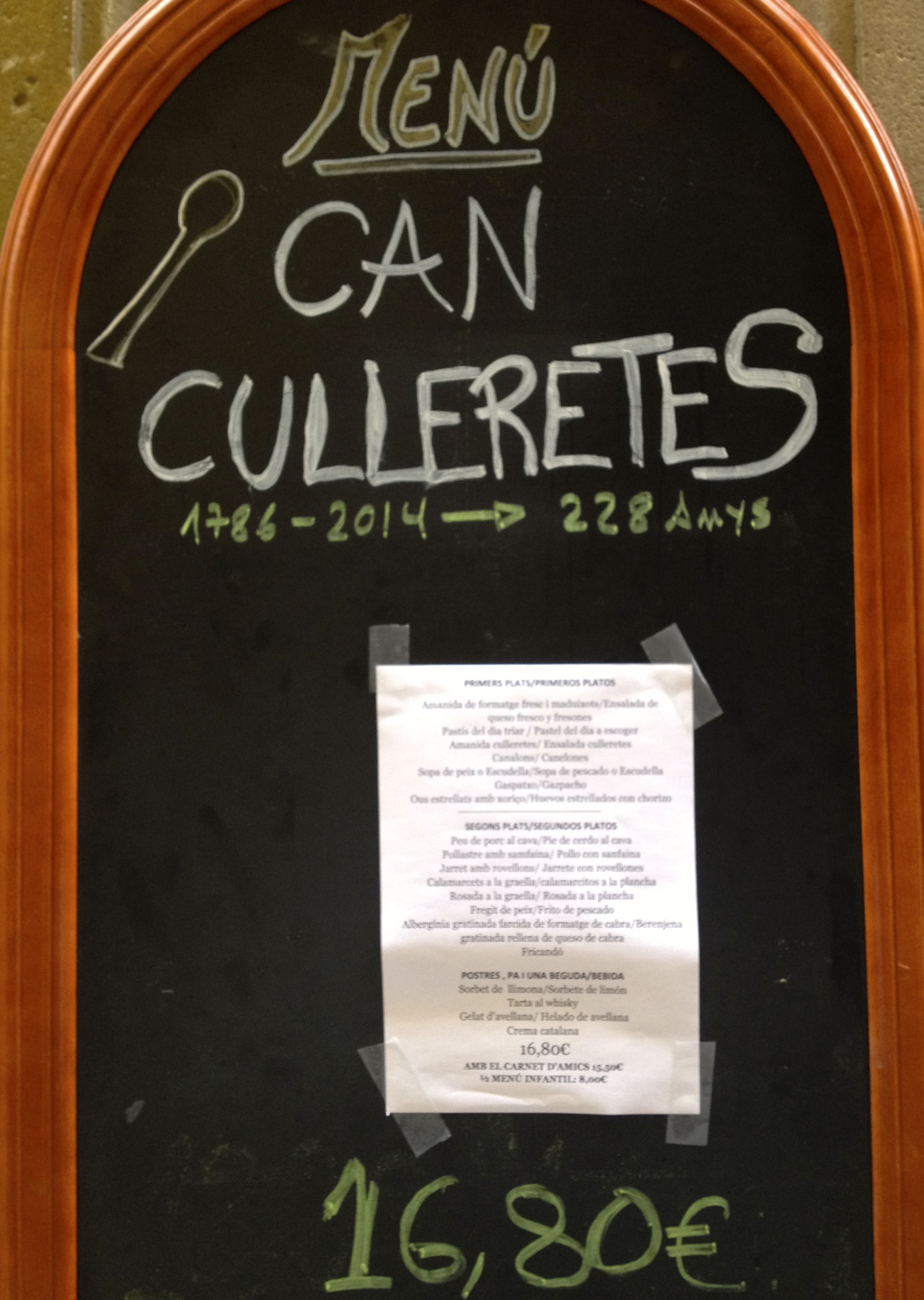 Can Culleretes is a recommended restaurant that was established in 1786, an impressive 228 years ago. Food and service were excellent. Barcelona is a beautiful city where I would love to spend more time someday. Friends who have been there love it, too.