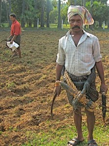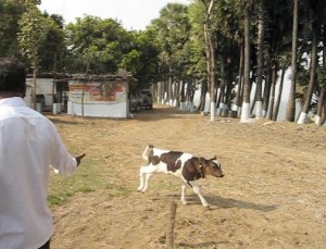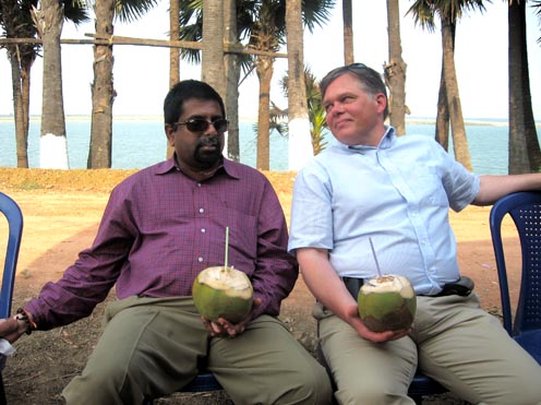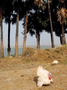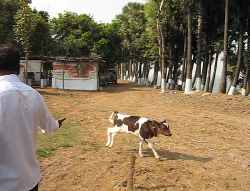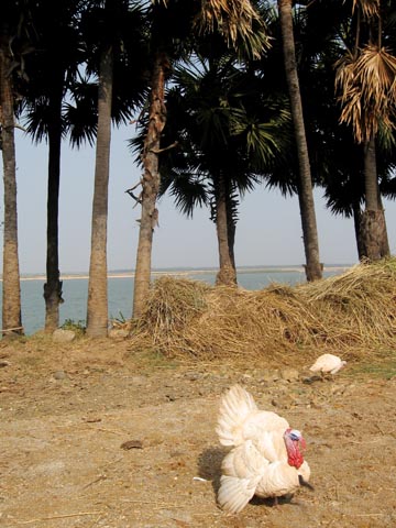 The farm sits on a bank 30 feet above the river. We could see islands where fishermen lived and worked, but in the rainy season those islands will be submerged. In fact, last August the river rose 50 feet and the farm was flooded by 20 feet of water. Krishna and crew had had to move the cattle, water buffalo, turkeys, chickens, guinea fowl, dogs, and people to higher ground. Crops sustained quite a bit of damage—the sugar cane, mangos, bananas, cashews, coconuts, and rice.