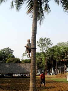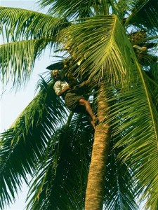 One of the workers climbed a palm tree in his bare feet with only a rubber belt for safety and a machete to cut down bunches of coconuts for us to enjoy.