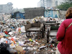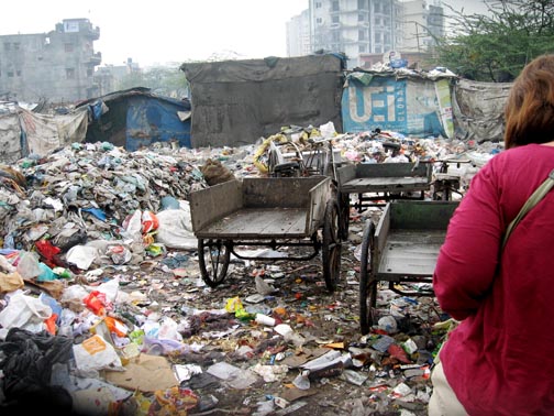Another amazing place we went was about an hour’s drive outside Delhi. It was a slum, or basti, one of about 70 in the area. You won’t find this described in The Lonely Planet guide for tourists. We don’t spend a lot of time thinking about trash. Streets are pretty clean in Delhi as big cities go, but not all the trash is carried away in large trucks.